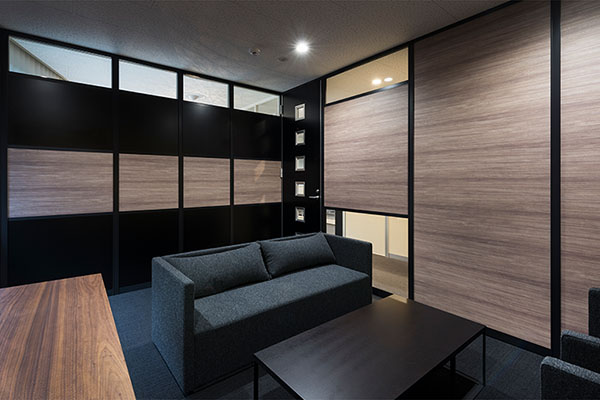 ブラックフレームにガラスパーテーション&重厚感のある木目のドアをアレンジしました。東京南青山の一等地にそびえ立つジェネクス様のオフィスには弊社の新製品「BLACKY」が最高にマッチしています。