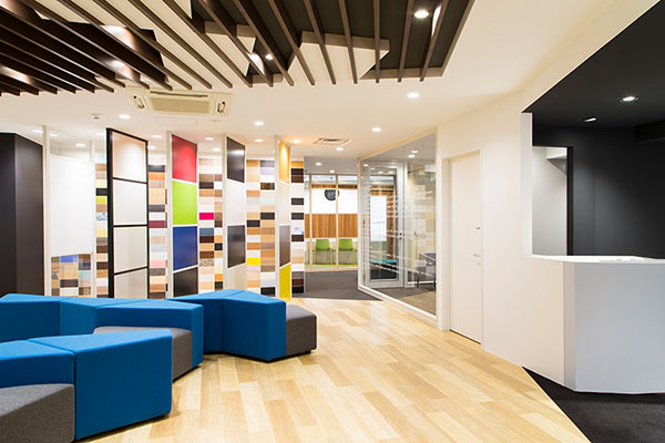 マーケティング&コンサル事業のジュブリーワークス様からのご依頼は「ワークスタイルを変えたい」。家具を木目とグリーンで統一して、パーテーションは弊社の新製品「BLACKY」を採用しました。「ストレスオフの空間」を社員の皆様と一緒にデザインしました。