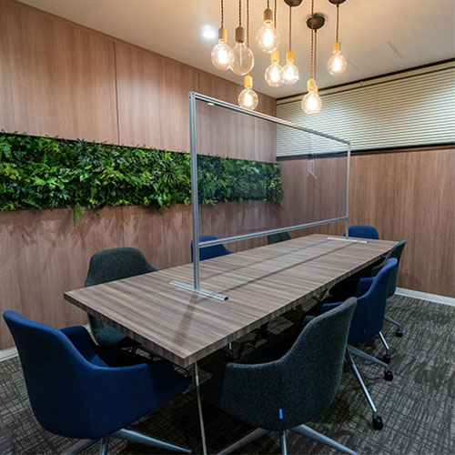 コミュニケーションを図りやすいようオフィスの中央等に社員が集まれる場所を設置し、ミーティンテーブルには状況に応じてアクリルパーテーションやローパーテーションを設置できるようにしておくことでテレワーク環境におけるコミュニケーション不足の解消へ繋がります。