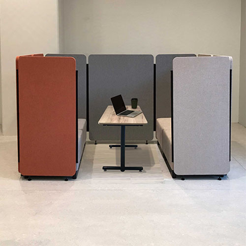 ブース型レイアウトでは、パーテーションをサイドと背面に設置し、前面は壁面に当てています。このレイアウトでは、オンラインミーティングの際に周囲の雑音をカットするように吸音パーテーションを採用しています。