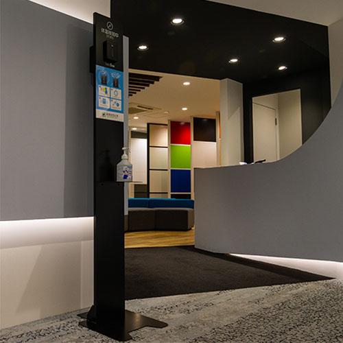 基本はオンラインで対応をしているが、来客を迎え入れるケースがあり、来客者への配慮として受付の無人化、クローズドスペース作りを実施し、感染予防対策を実施したい。